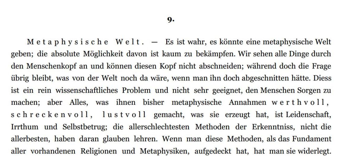 “It is true that there might be a metaphysical world; the absolute possibility of it is hardly (kaum or barely) to be disputed “I think that Nietzsche means the link between the outside world and the thing that perceives it in our “head”. The link is the “metaphysical world”, “we look at everything through the human head and cannot cut this head off” Would there be a world without our head. Is N. referring to the famous tree allegory?1 There is not a world as we perceive it outside our human perception, think about colors we see vs the “real” colors2. But everything that makes metaphysical assumptions “valuable, terrible, delightful for man” is caused by “passion, error, and self-deception;” If people try to explain this link human failure causes the outcome. the worst method of getting knowledge, “not the best” If you find this at the basis of religion and metaphysics than “they (the metaphysical world) have been refuted. Then there still always remains that possibility N refers here to the possibility of a metaphysical world; but there is nothing to be done with it”. But is “it possible to let happiness, salvation, and life depend on the spider-thread of such a possibility.” This metaphysical world is “incomprehensible to us” It is impossible to envision the link between the real world and what we perceive, it’s like directly seeing gravity. If it would be proved it would be irrelevant knowledge. “more irrelevant than the knowledge of the chemical analysis of water to the sailor in danger in a storm.”