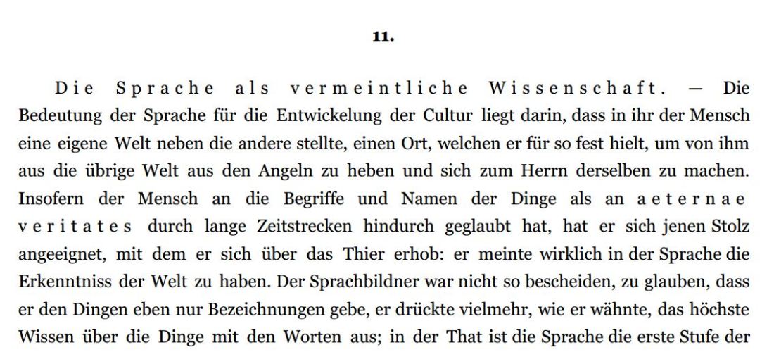 11. Die Sprache als vermeintliche Wissenschaft. – Die Bedeutung der Sprache für die Entwickelung der Cultur liegt darin, dass in ihr der Mensch eine eigene Welt neben die andere stellte, einen Ort, welchen er für so fest hielt, um von ihm aus die übrige Welt aus den Angeln zu heben und sich zum Herrn derselben zu machen. Insofern der Mensch an die Begriffe und Namen der Dinge als an aeternae veritates durch lange Zeitstrecken hindurch geglaubt hat, hat er sich jenen Stolz angeeignet, mit dem er sich über das Thier erhob: er meinte wirklich in der Sprache die Erkenntniss der Welt zu haben. Der Sprachbildner war nicht so bescheiden, zu glauben, dass er den Dingen eben nur Bezeichnungen gebe, er drückte vielmehr, wie er wähnte, das höchste Wissen über die Dinge mit den Worten aus; in der That ist die Sprache die erste Stufe der Bemühung um die Wissenschaft. Der Glaube an die gefundene Wahrheit ist es auch hier, aus dem die mächtigsten Kraftquellen geflossen sind. Sehr nachträglich -jetzt erst – dämmert es den Menschen auf, dass sie einen ungeheuren Irrthum in ihrem Glauben an die Sprache propagirt haben. Glücklicherweise ist es zu spät, als dass es die Entwickelung der Vernunft, die auf jenem Glauben beruht, wieder rückgängig machen könnte. – Auch die Logik beruht auf Voraussetzungen, denen Nichts in der wirklichen Welt entspricht, z.B. auf der Voraussetzung der Gleichheit von Dingen, der Identität des selben Dinges in verschiedenen Puncten der Zeit: aber jene Wissenschaft entstand durch den entgegengesetzten Glauben (dass es dergleichen in der wirklichen Welt allerdings gebe). Ebenso steht es mit der Mathematik, welche gewiss nicht entstanden wäre, wenn man von Anfang an gewusst hätte, dass es in der Natur keine exact gerade Linie, keinen wirklichen Kreis, kein absolutes Grössenmaass gebe.