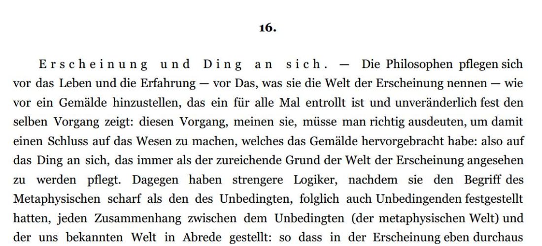 - Erscheinung und Ding an sich. – Die Philosophen pflegen sich vor das Leben und die Erfahrung – vor Das, was sie die Welt der Erscheinung nennen – wie vor ein Gemälde hinzustellen, das ein für alle Mal entrollt ist und unveränderlich fest den selben Vorgang zeigt: diesen Vorgang, meinen sie, müsse man richtig ausdeuten, um damit einen Schluss auf das Wesen zu machen, welches das Gemälde hervorgebracht habe: also auf das Ding an sich, das immer als der zureichende Grund der Welt der Erscheinung angesehen zu werden pflegt. Dagegen haben strengere Logiker, nachdem sie den Begriff des Metaphysischen scharf als den des Unbedingten, folglich auch Unbedingenden festgestellt hatten, jeden Zusammenhang zwischen dem Unbedingten (der metaphysischen Welt) und der uns bekannten Welt in Abrede gestellt: so dass in der Erscheinung eben durchaus nicht das Ding an sich erscheine, und von jener auf dieses jeder Schluss abzulehnen sei. Von beiden Seiten ist aber die Möglichkeit übersehen, dass jenes Gemälde – Das, was jetzt uns Menschen Leben und Erfahrung heisst – allmählich geworden ist, ja noch völlig im Werden ist und desshalb nicht als feste Grösse betrachtet werden soll, von welcher aus man einen Schluss über den Urheber (den zureichenden Grund) machen oder auch nur ablehnen dürfte. Dadurch, dass wir seit Jahrtausenden mit moralischen, ästhetischen, religiösen Ansprüchen, mit blinder Neigung, Leidenschaft oder Furcht in die Welt geblickt und uns in den Unarten des unlogischen Denkens recht ausgeschwelgt haben, ist diese Welt allmählich so wundersam bunt, schrecklich, bedeutungstief, seelenvoll geworden, sie hat Farbe bekommen, – aber wir sind die Coloristen gewesen: der menschliche Intellect hat die Erscheinung erscheinen lassen und seine irrthümlichen Grundauffassungen in die Dinge hineingetragen. Spät, sehr spät – besinnt er sich: und jetzt scheinen ihm die Welt der Erfahrung und das Ding an sich so ausserordentlich verschieden und getrennt, dass er den Schluss von jener auf dieses ablehnt – oder auf eine schauerlich geheimnissvolle Weise zum Aufgeben unsers Intellectes, unsers persönlichen Willens auffordert: um dadurch zum Wesenhaften zu kommen, dass man wesenhaft werde. Wiederum haben Andere alle charakteristischen Züge unserer Welt der Erscheinung – das heisst der aus intellectuellen Irrthümern herausgesponnenen und uns angeerbten Vorstellung von der Welt – zusammengelesen und anstatt den Intellect als Schuldigen anzuklagen, das Wesen der Dinge als Ursache dieses thatsächlichen, sehr unheimlichen Weltcharakters angeschuldigt und die Erlösung vom Sein gepredigt. – Mit all diesen Auffassungen wird der stetige und mühsame Process der Wissenschaft, welcher zuletzt einmal in einer Entstehungsgeschichte des Denkens seinen höchsten Triumph feiert, in entscheidender Weise fertig werden, dessen Resultat vielleicht auf diesen Satz hinauslaufen dürfte: Das, was wir jetzt die Welt nennen, ist das Resultat einer Menge von Irrthümern und Phantasien, welche in der gesammten Entwickelung der organischen Wesen allmählich entstanden, in einander verwachsen [sind] und uns jetzt als aufgesammelter Schatz der ganzen Vergangenheit vererbt werden, – als Schatz: denn der Werth unseres Menschenthums ruht darauf. Von dieser Welt der Vorstellung vermag uns die strenge Wissenschaft thatsächlich nur in geringem Maasse zu lösen – wie es auch gar nicht zu wünschen ist -, insofern sie die Gewalt uralter Gewohnheiten der Empfindung nicht wesentlich zu brechen vermag: aber sie kann die Geschichte der Entstehung jener Welt als Vorstellung ganz allmählich und schrittweise aufhellen – und uns wenigstens für Augenblicke über den ganzen Vorgang hinausheben. Vielleicht erkennen wir dann, dass das Ding an sich eines homerischen Gelächters werth ist: dass es so viel, ja Alles schien und eigentlich leer, nämlich bedeutungsleer ist.