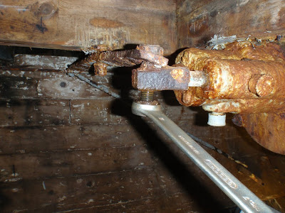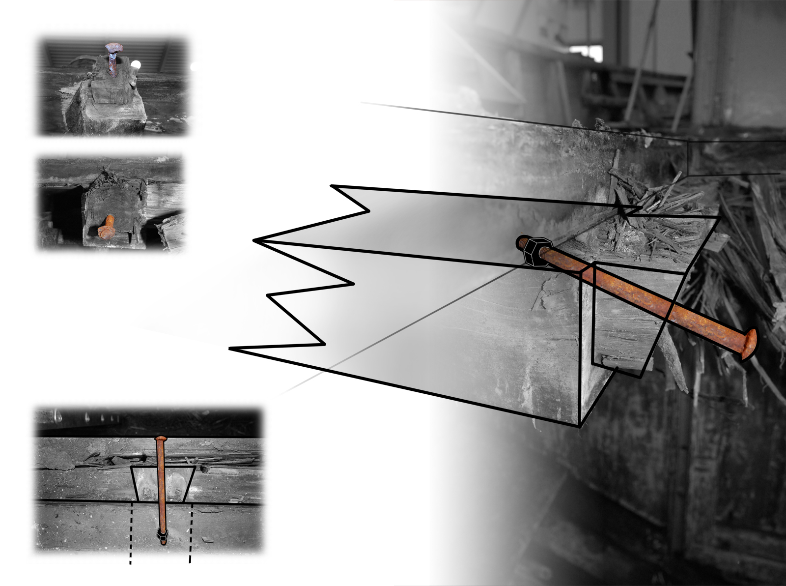 We found a unique construction, normally this is an all wooden construction with maybe a nail in it Often you find a special flat bold alongside the beam but here the bolt goes through the middle and is tightened with a nut, we will find out more later.