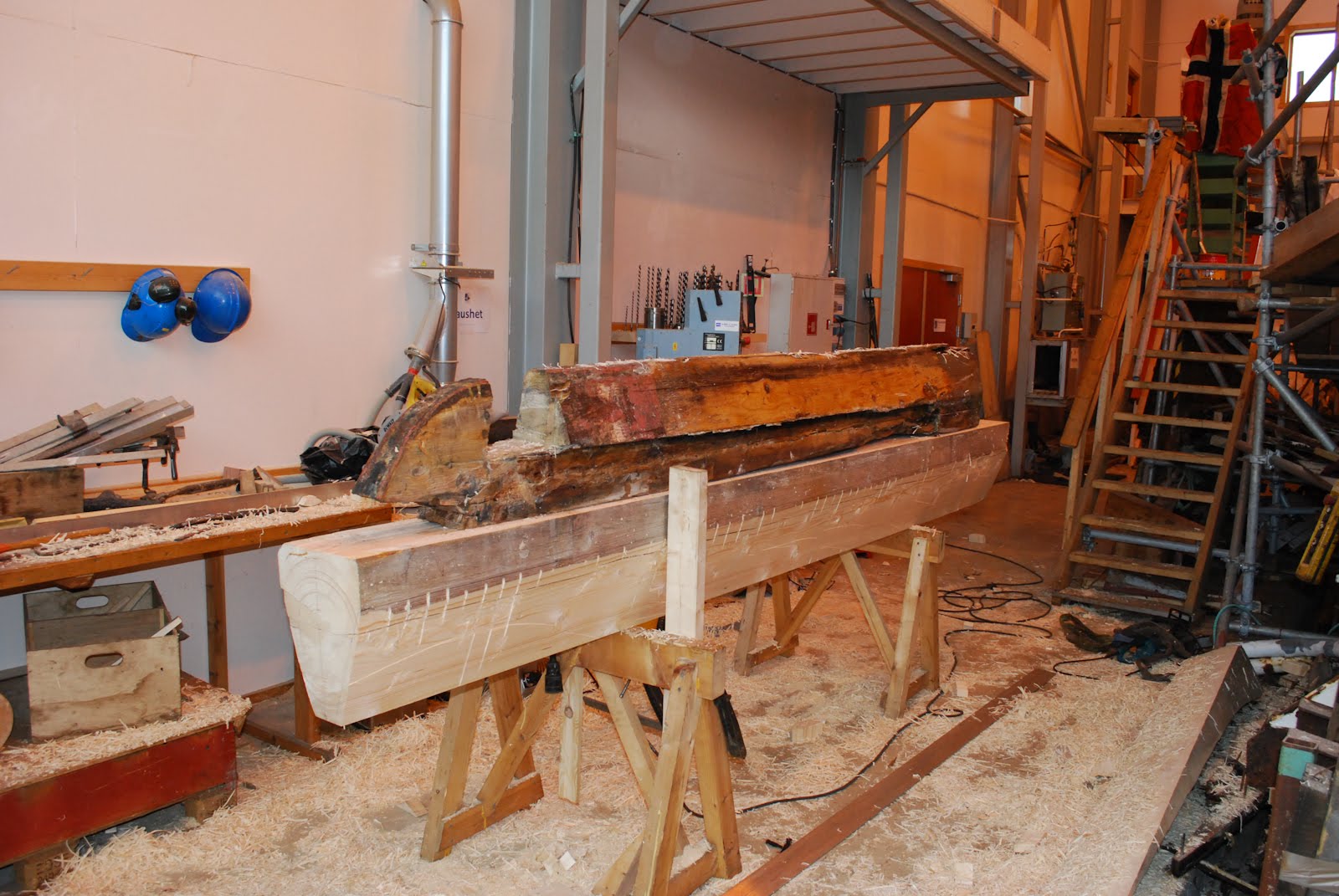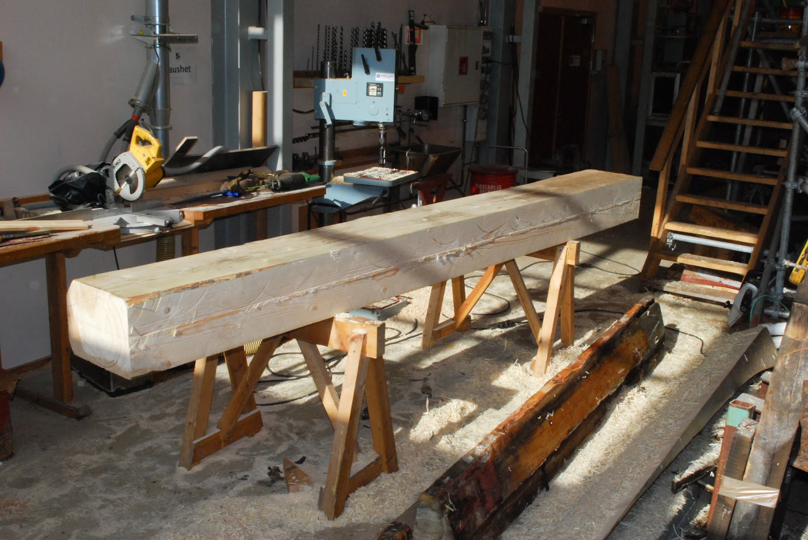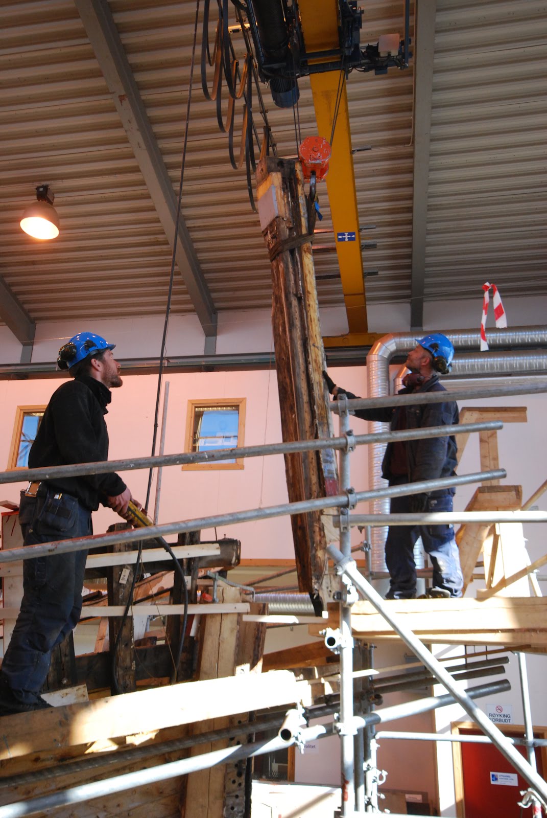 With an ax and a planer I made the wedged shape and now I use the old stem as a mall. It’s hard to see which methods they used when they first made this stem. We did some resurge to find out what kind of tools they had but that’s not an easy task. For now I assume that the individual carpenter that worked at Stenson og sønner had his own methods just like it is today. Lifting the stevn…