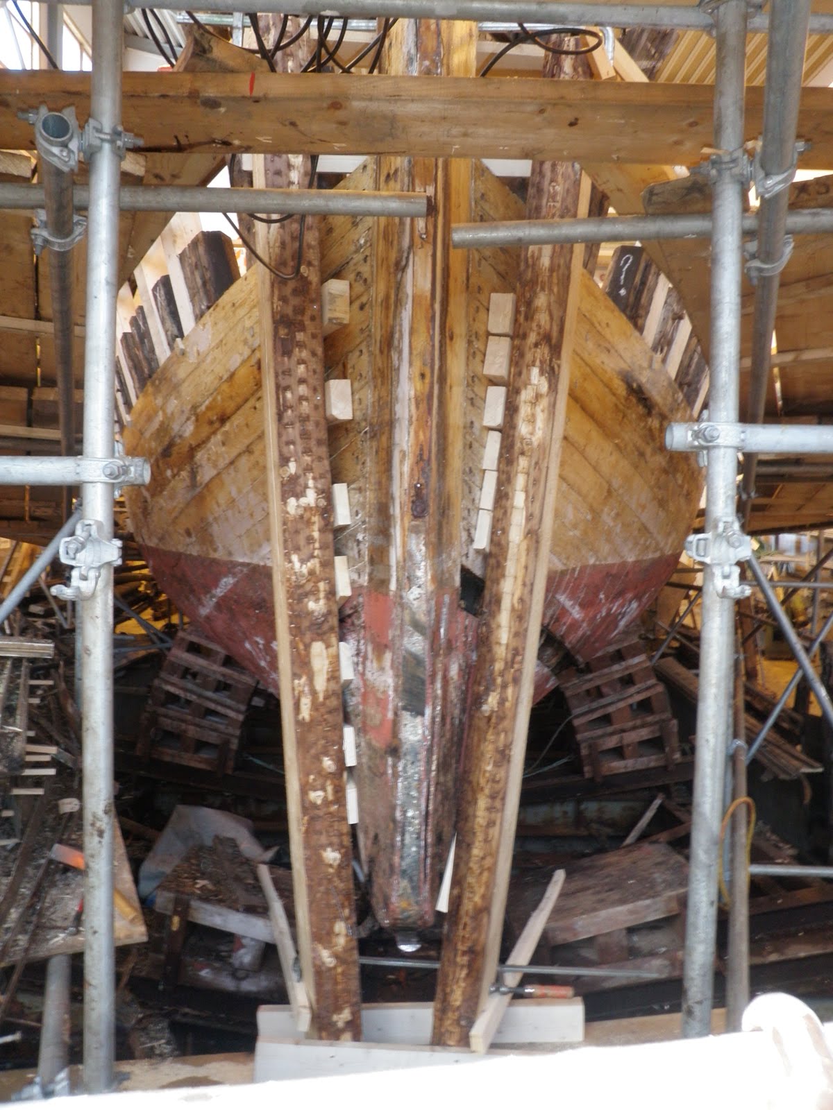 After two weeks helping with a new building here at Fartøyversenter Joost and I started working again on Brottsjø. The first thing we did was taking out the stem or “stevn” in Norwegian. The biggest job was to take out the old nails without damaging the planks of the skin. After a day work this was done and after removing 4 long bolts that connect the stem with a root that is connected to the keel we lifted it up.