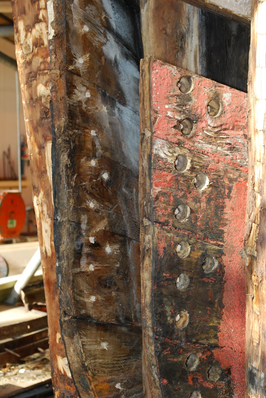 The skin is good, we have plugged the holes so that we can make new ones later. Normally the planks keep the same thickness all the way to the end, the stem is changed to make it fit. With Brottsjø they made the ends of the planks thinner to have a nice fit. This is strange because from the 5cm thickness there is only 3,5/4cm left, not mush to hold on for the nails. They made it thinner with an axe, but it is not clear if the stem is changed before or that this is original, in that case it lasted for more than 70 years and is this construction good enough.