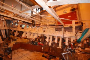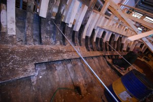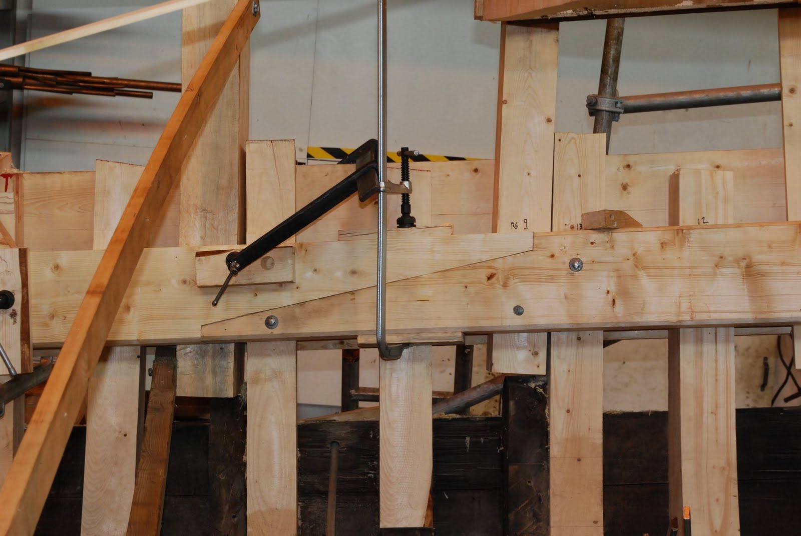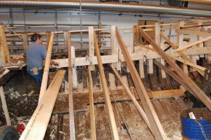 Because all the deck beams are gone Joost had to strengthen the construction while mounting the 3 inch thick “bjelkeveger” or beam-barer. It’s an extra thick plank on the inside of the hull where the deck beams are mounted on, we wanted to make sure that the original shape of the hull was not changed wile pressing this thick plank in.