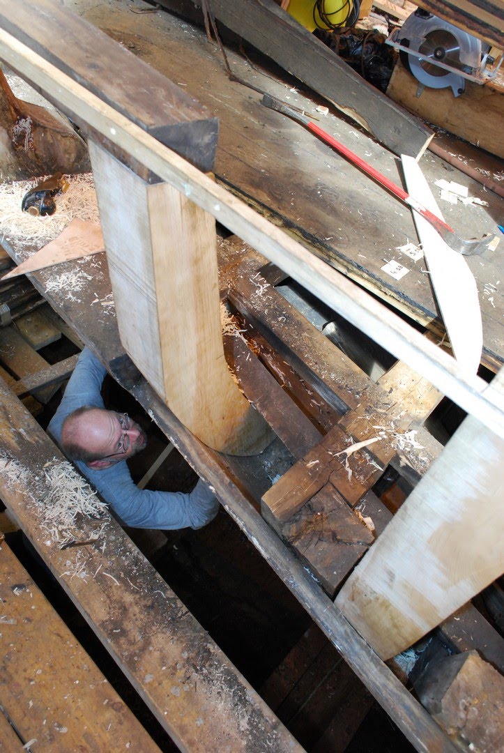 Martin repaired the two ends of the “livholt” and now Joost is helping to see if they can get one of the rotten pegs out, next week they have to see if they can find the peg on the outside because from here it isn’t working.