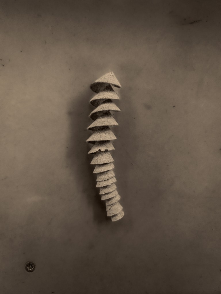 I a certain way… I took this picture today after I driled a hole in a piece of wood and the drill bitt produced this rather beautiful leftover, I removed the wood so I could replace it with a better looking plug. But the metaphor is that by removing suspected flaws that seem to be ugly you might regret it when you see it separated, (maybe later in life) , maybe the flaw is only ugly when you think it’s part of you, or that it defines you. Something like that.