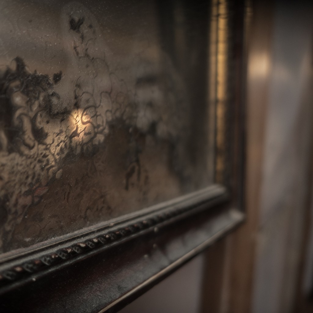 I am looking in an old mirror forgotten stored in the attic where I found it the silver lining underneath my face cracked while seeing myself in a dozen Interrupted facets outlined by dirty decay I move away but I only get smaller though now I can see that it once was all clear. ~ I like the delicate frame of this so familiar this frame with that little bit of dust on it seemingly stuck.