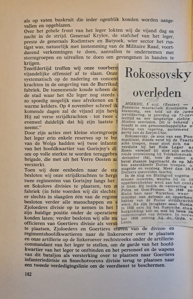 Today, I bought a secondhand book about Tsjoeikov, a famous Russian marshal. I am interested in books like that, but I especially liked that the book was filled with newspaper clippings from the early 1970s. I have not counted how many clippings there are in the book, but I guess there are more than a hundred nice surprises. Secondhand bookstores are the best, and I (my wallet) am happy that I can only visit them once every two years when I am in Holland.