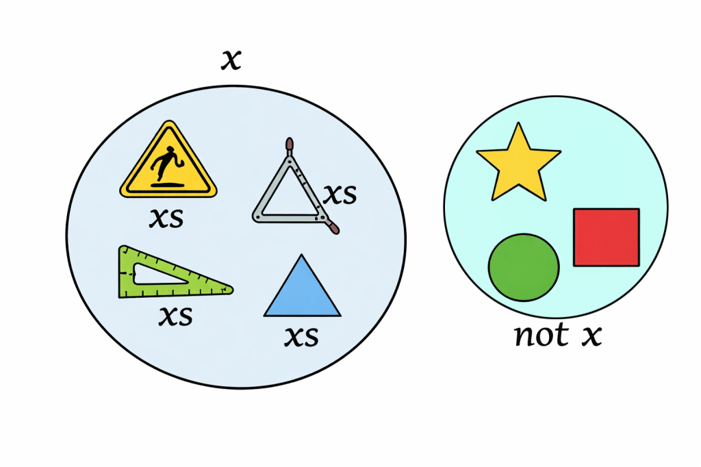 If x = triangle, then xs are all the particular triangles (this drawn triangle, that road sign, any triangle at all).
