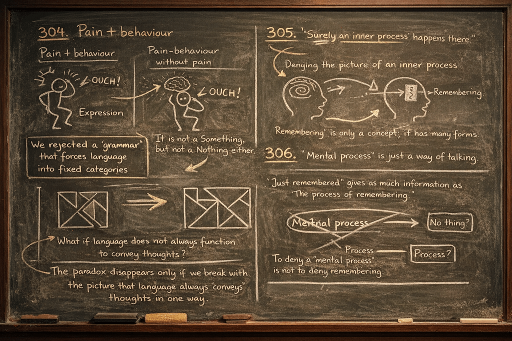 306.“Why then should I deny that there is a mental process? Only because ‘There has taken place in me the mental process of remembering’ means nothing other than: ‘I have just remembered …’. To deny the mental process would mean to deny remembering; to deny that someone remembers something.”