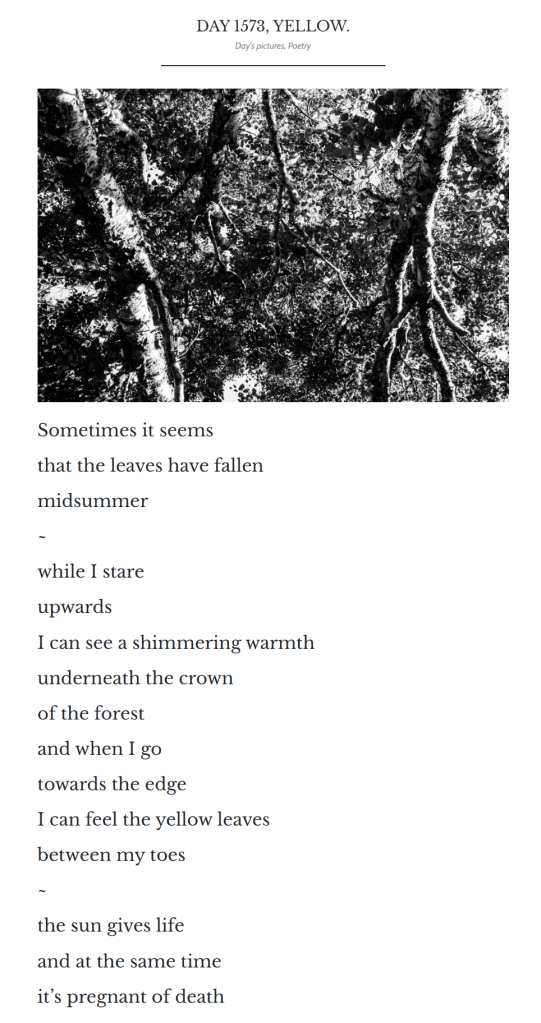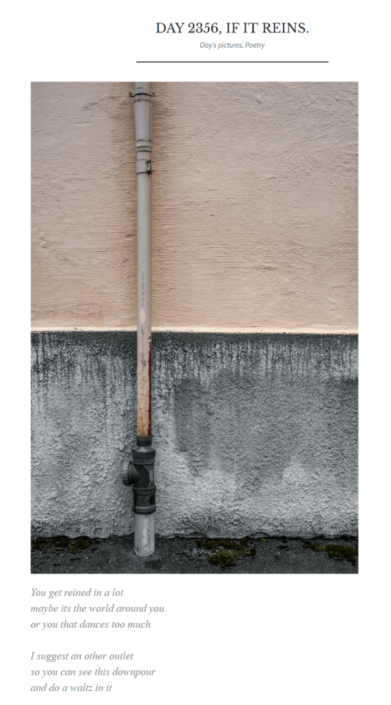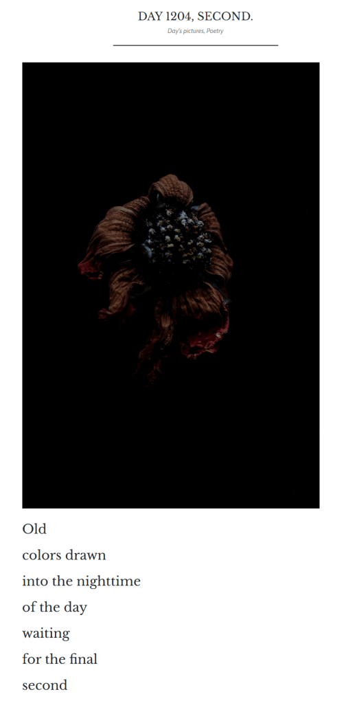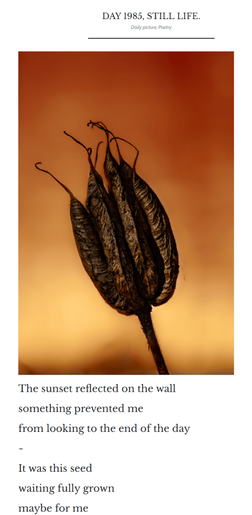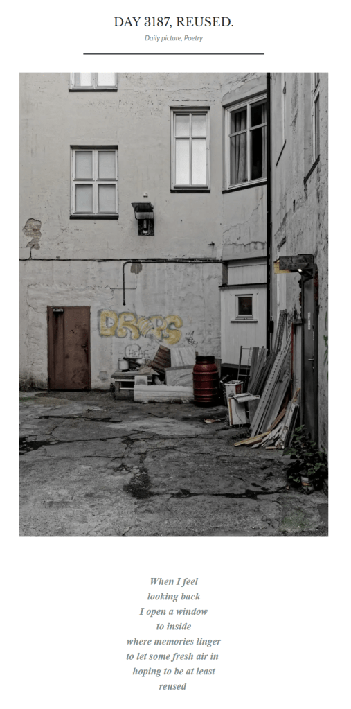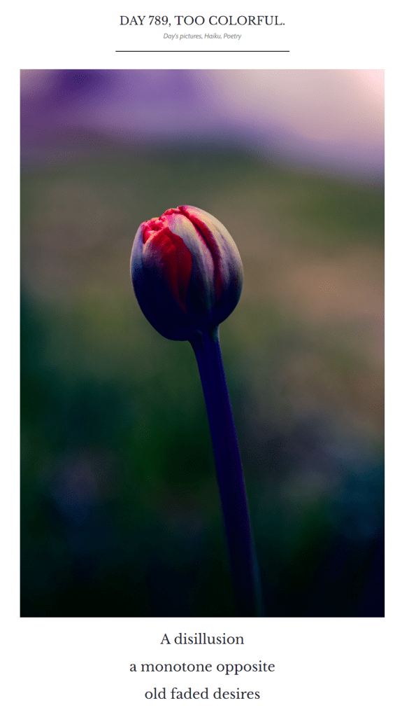 It never feels like a burden to write every day. It is so normal now that I see no reason to quit. Even on the busiest days, I always find a few minutes to snap an interesting picture with my phone, write a three-sentence poem-like thing, and post it. I can do that on the toilet if I have to. But seriously, for someone like me who thinks way too much and knows all too well how repetitive daily life is, these five minutes on the toilet, or more normally, 30 minutes to an hour behind my computer looking for a cool picture, editing it, and getting inspired to write something about it, keep me going. Without art, life is not much worth.