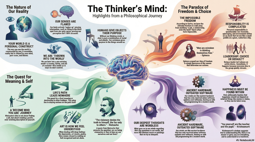 Another central thread is the fragility of the self. Memory, he reminds us, is a storyteller that constantly rewrites the past to protect the present. The self is a creature of filters: “My two-way filter is partially broken,” he admits, “and I can only fix one side.” Here his philosophy leans toward a kind of grounded humility—an acceptance that what we call “I” is stitched together from sensation, error, upbringing, chemicals, and luck.