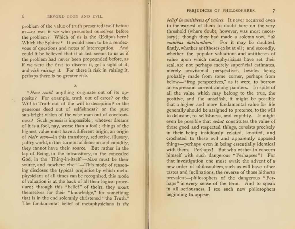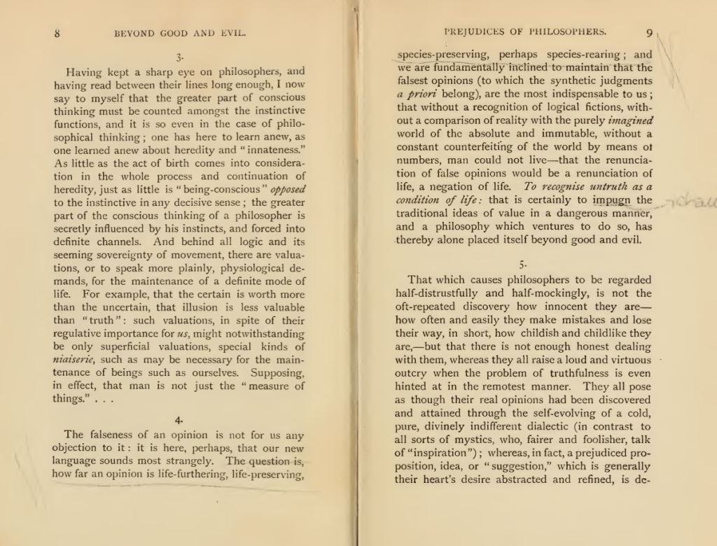This aphorism is more self-explanatory. I don’t know if Nietzsche celebrates the act of war; he was a medic in the Franco-Prussian war of 1870, but I don’t know if he was confronted by the violence of war or only by the result of exploding bombshells. Most people who knew Nietzsche say that he was a friendly man, kind and polite. Not the typical war monger or brut you might think of when reading some of his works. I think that war was, for Nietzsche, more of an abstraction than the gruesome reality it is. There have always been periods through history where society suddenly takes a few steps forward, and this might often seem to happen after a war, but it is hard to unravel what happens in a society, especially when something as gruesome as a war is going on. I know that for many people, war is still something to celebrate, probably for other reasons than Nietzsche does, but for me, raised at the end of the Cold War by a passivist mother, war is something you want to avoid.