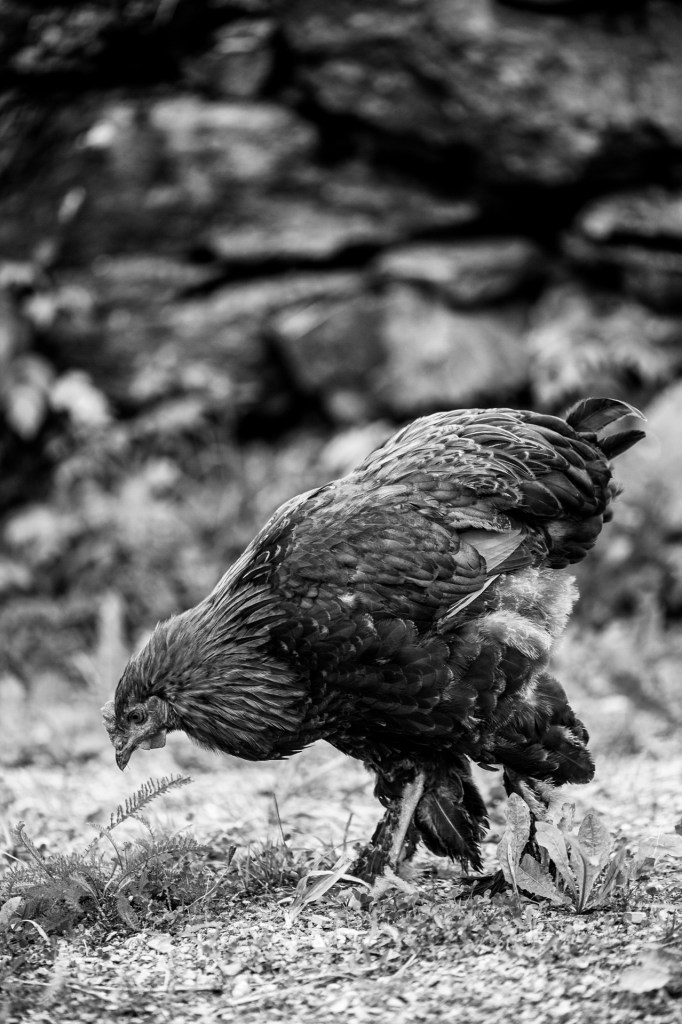 I like to look at the chickens in our garden. I like their behavior, they move like people do, but with no arms. They also move together, but don’t care for each other. Some wander off, but never to far. They act like they always starve, chasing sudden movements of a hand that points, in expectance. And most striking, they let it all go without care, even when they step in it, on their way back.