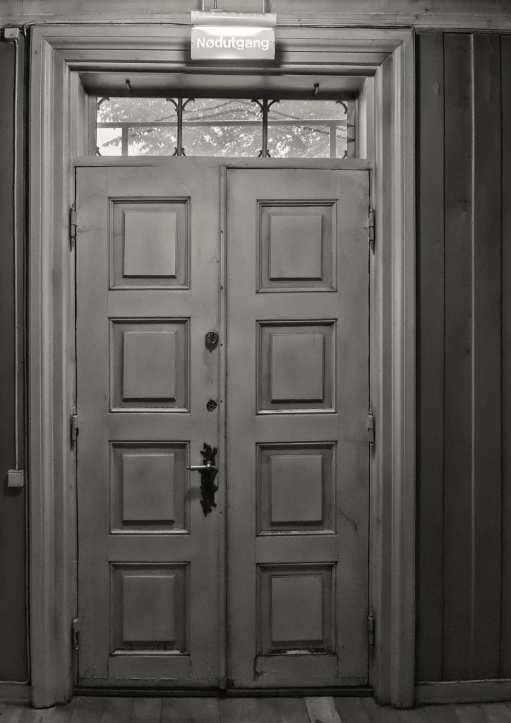 Part of my work is restoring old doors, and today I started with this door. This is an old door that is now in use as an emergency exit that also sometimes gets used for special occasions. It is in the main Library here in Trondheim, and the head historian of Trondheim told me today that she believes it was already part of the building before it got renovated in 1831. The door has been restored before, probably in the seventies, but the original fittings are still there, and only parts of the wooden construction (the lock stile) are relatively new.